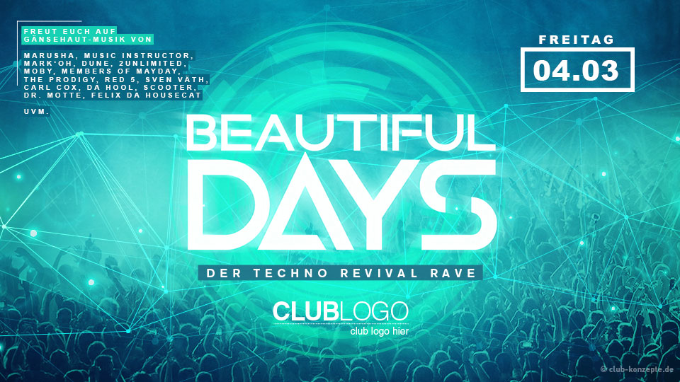 Waren das nicht „BEAUTIFUL DAYS“? Oder besser gesagt die geilsten Nächte! Wir machen die Nacht zum Tag und feiern mit euch den fettesten Techno Revival Rave des Sektors! Getreu dem Motto „früher war alles Bässer“ hat unser hochkarätiges DJ Line-Up für euch die tanzbarsten Techno Hits und Klassiker der letzten 20 Jahre in den Plattenkoffern am Start!